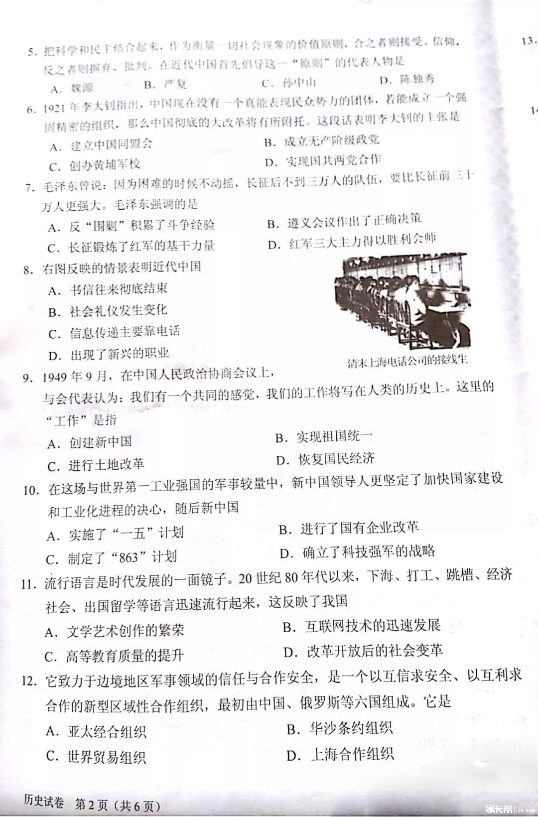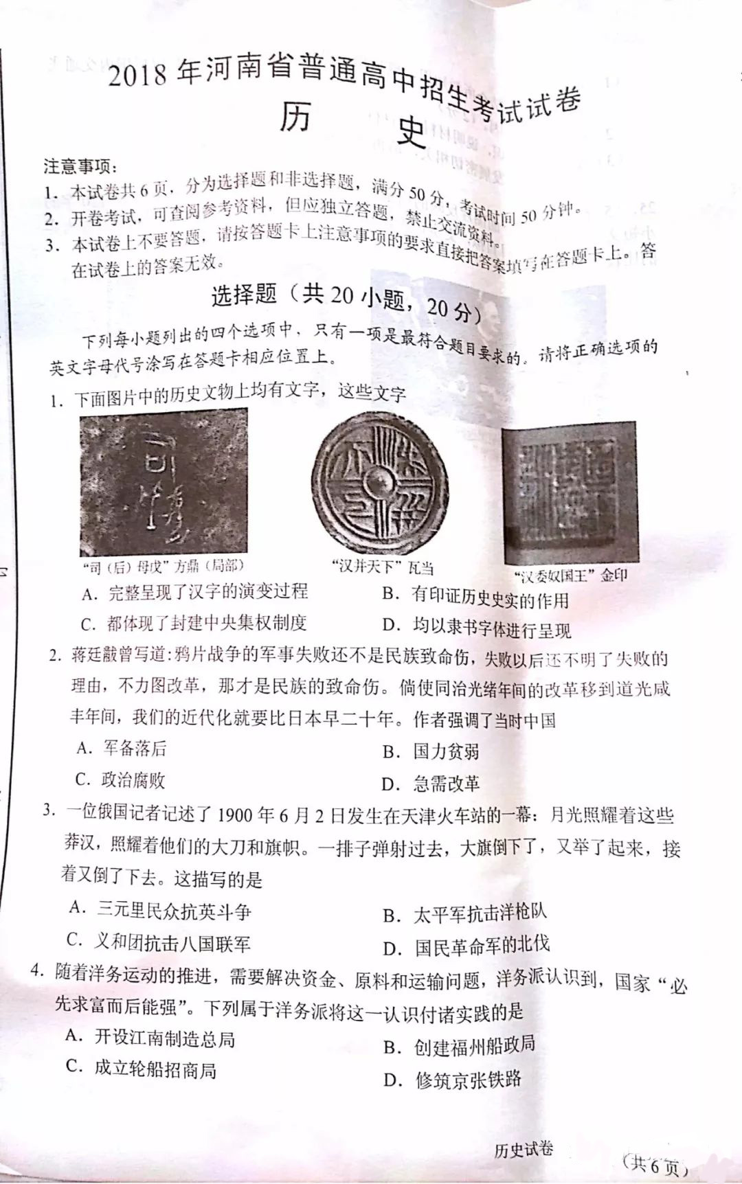 2020年河南省中招考試歷史試卷及答